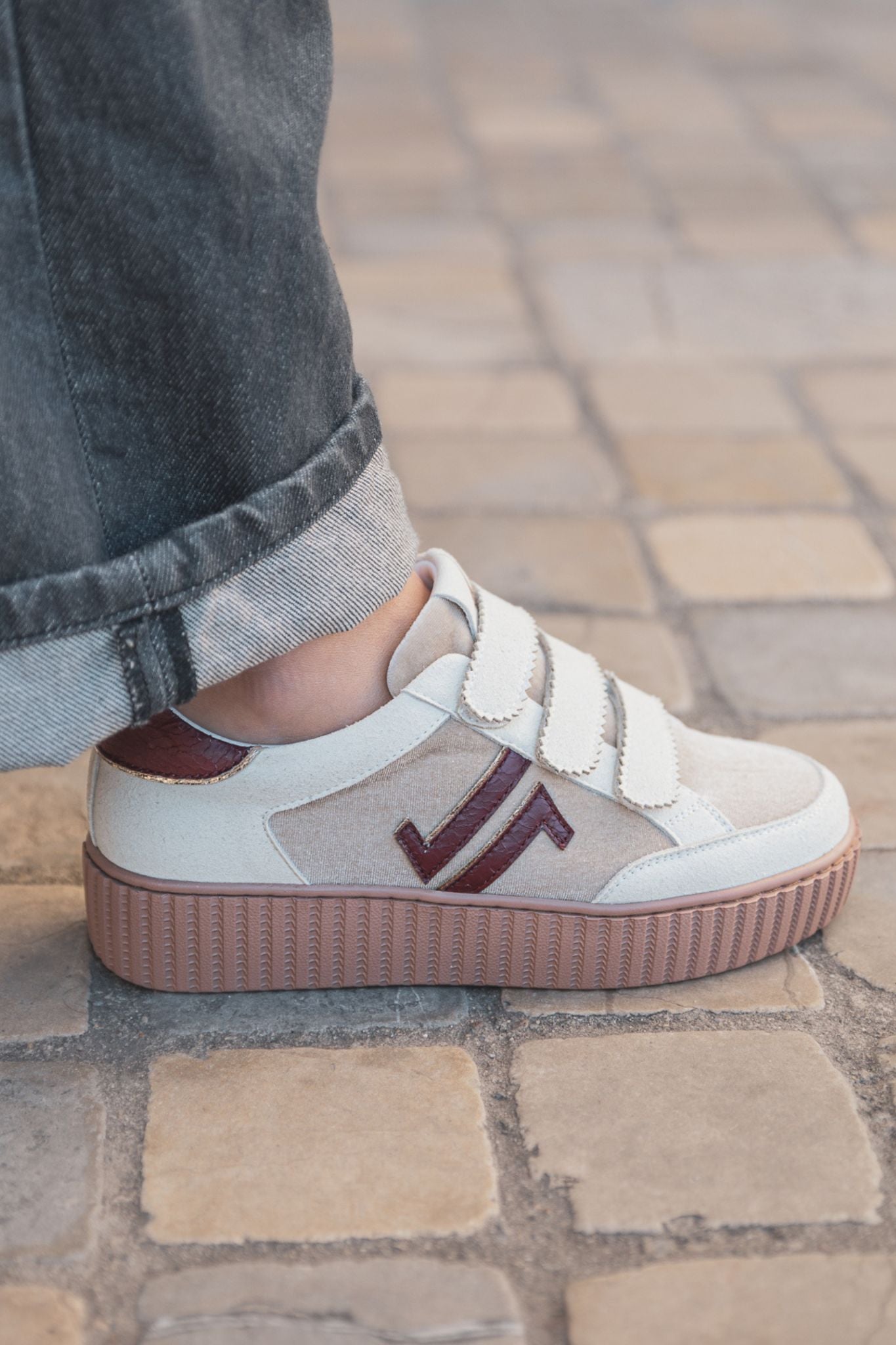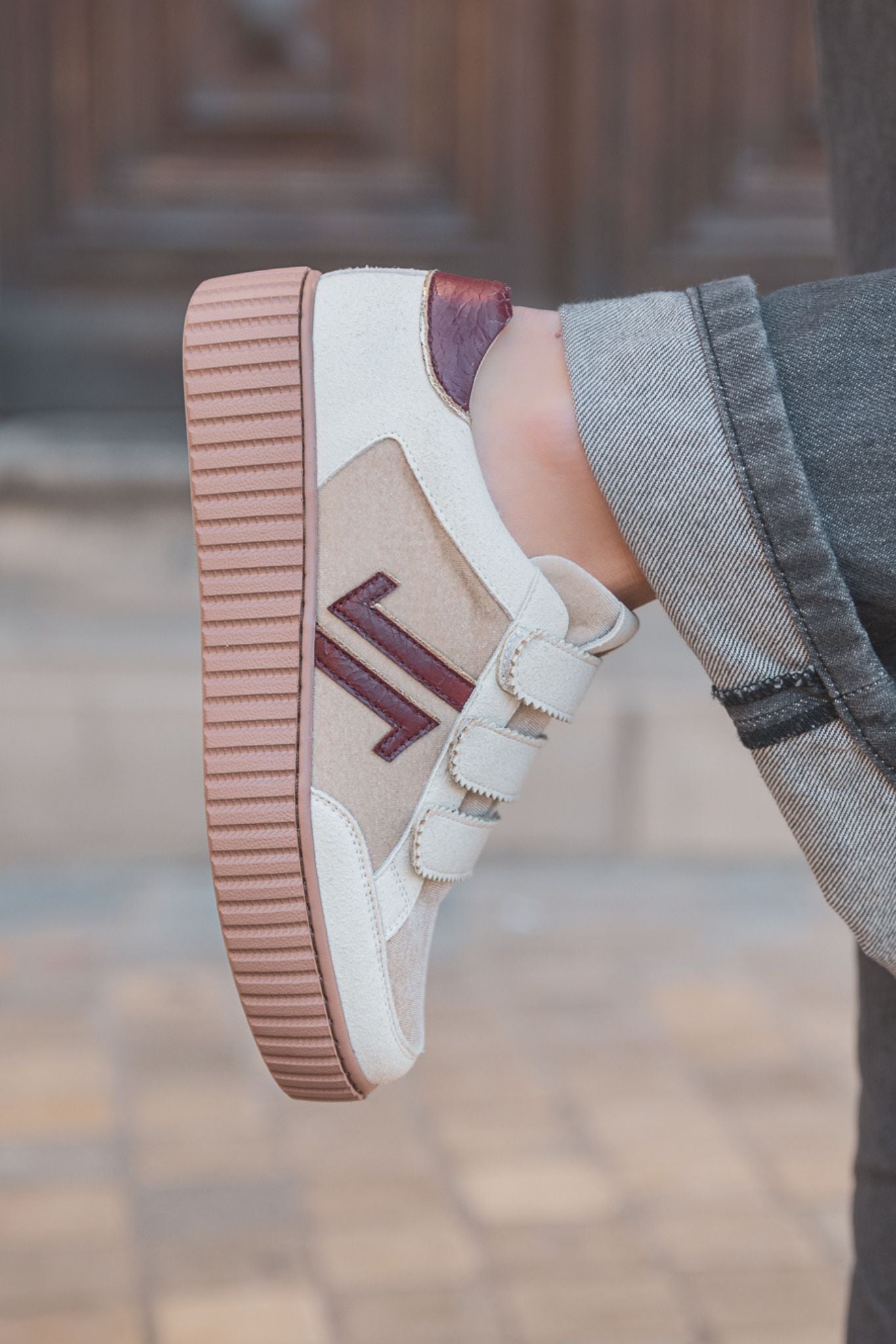 Son empeigne en suède beige est sublimée par un logo verni bordeaux, ajoutant une touche de contraste chic.