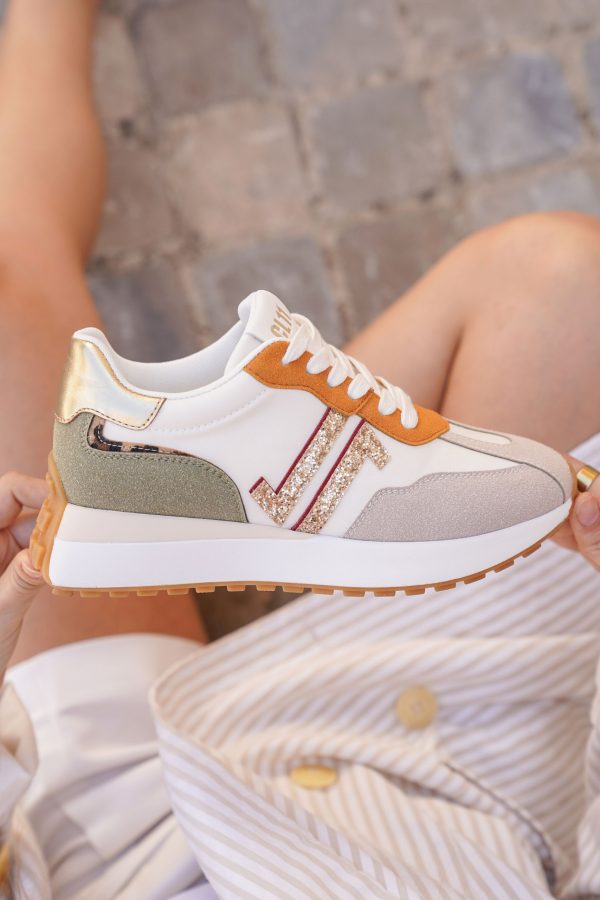 Baskets femme multicolores CL11 au design affirmé et original, combinant harmonieusement textures et effets. Ce modèle joue sur les contrastes avec un empiècement arrière en suédine vert olive, un talon doré métallisé, une pièce latérale en glitter doré soulignée d’un liseré rose, et un mélange de beige, camel et blanc cassé pour un rendu visuel impactant. La semelle oversize crantée assure une bonne accroche et un confort de marche optimal. Une basket tendance et distinctive, idéale pour les acheteuses en quête de modèles accrocheurs à forte valeur ajoutée en rayon.