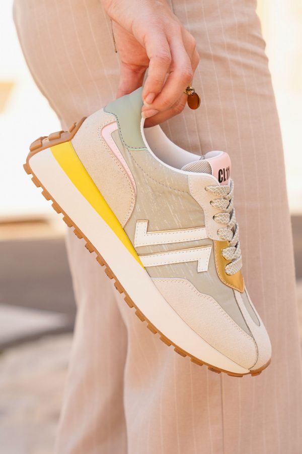 • Semelle : Bicolore crème et jaune, crantée en gomme, style running