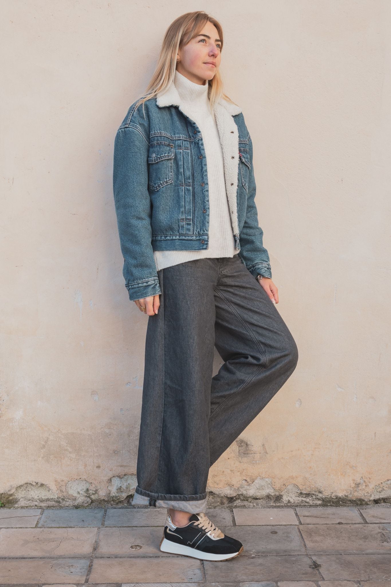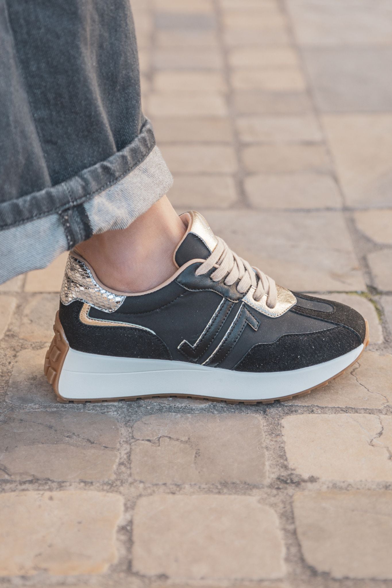 Le talon métallisé doré et les détails en cuir ajoutent une touche luxueuse, tandis que la semelle blanche assure un confort optimal.